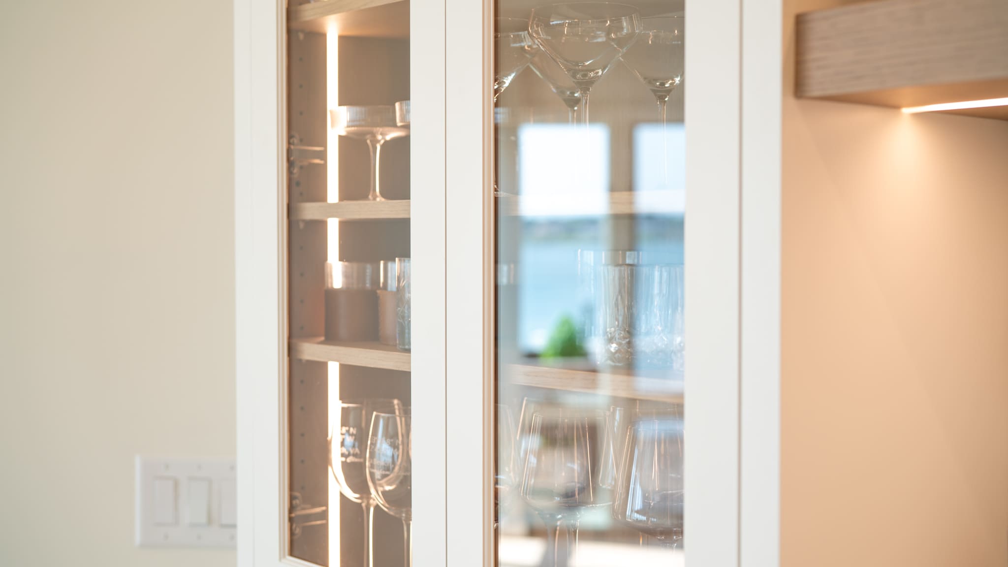 The staircase is a focal architectural detail, designed with crisp white risers and natural wood treads and railing. Its curved design softens the space and adds a touch of craftsmanship to the transitional layout.