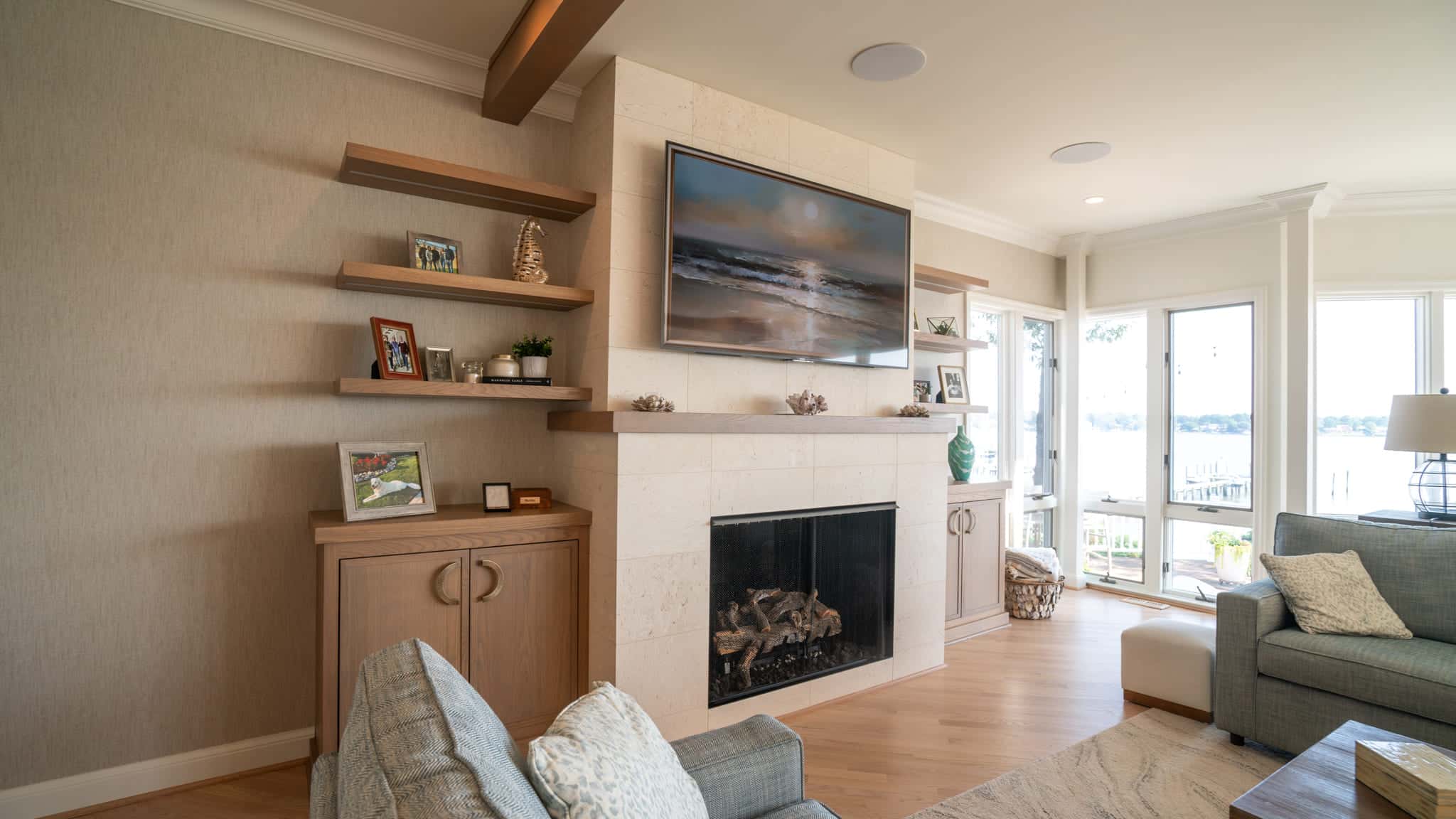 The main living space features soaring ceilings with skylights, expansive floor-to-ceiling windows, and wide plank hardwood floors that carry throughout the home. A custom sectional anchors the living room, complemented by a sleek tile fireplace wall with built-in mantel and a wall-mounted TV. Neutral tones and clean lines provide a timeless backdrop while highlighting the panoramic waterfront views.